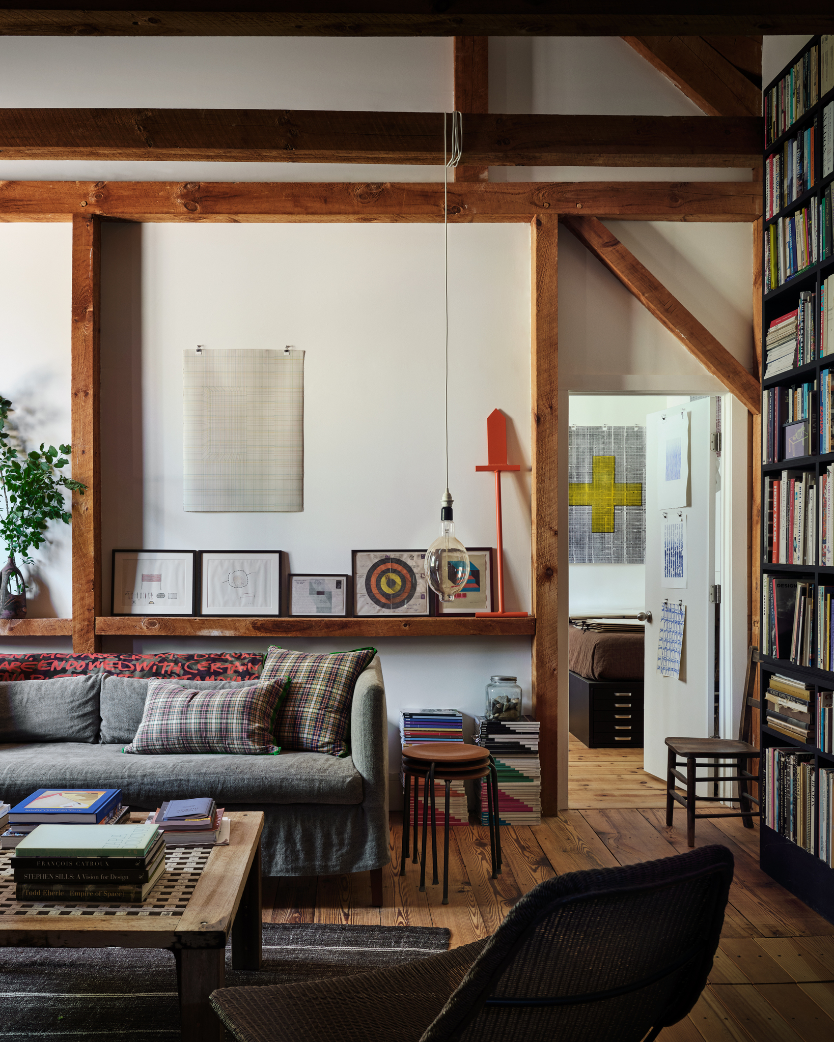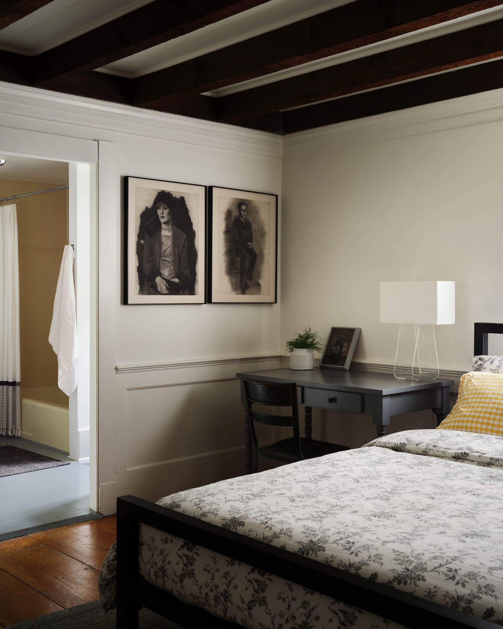 We did make two minor architectural changes to the cottage that made a big difference. In the kitchen, we removed a rabbit warren of old pantries and a sort of half loft. This left the kitchen as one big open space. In an upstairs bedroom that sits under the pitch of the roof, we removed a ceiling to expose the rafters and the significant height above them.